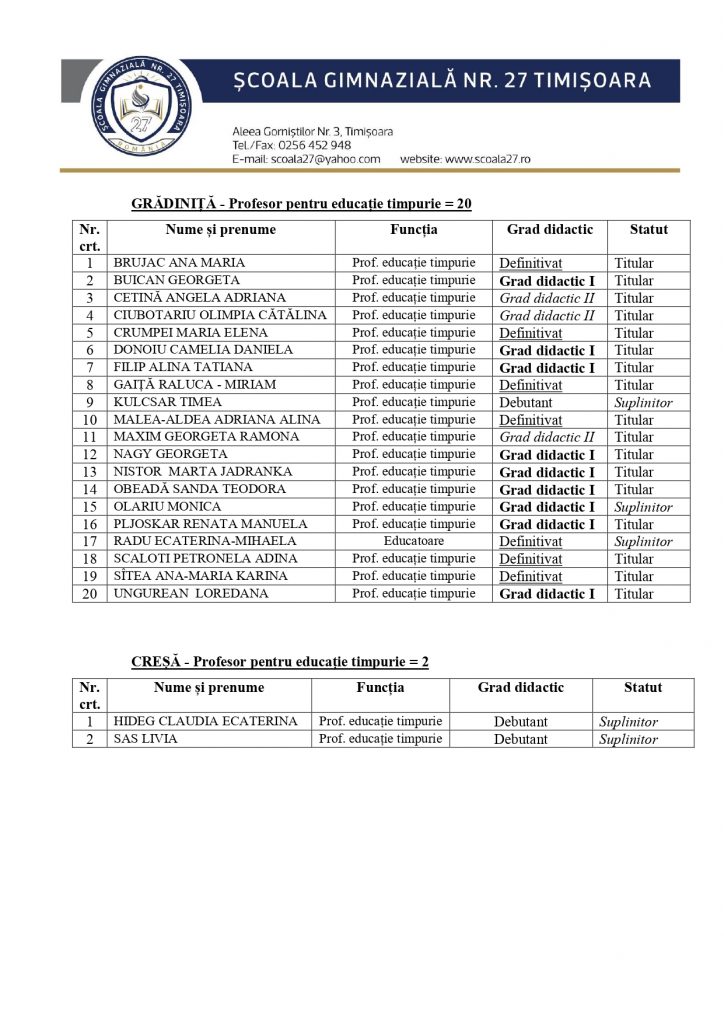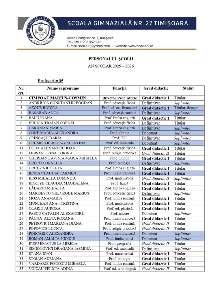 Pentru anul școlar 2025-2026, profesorii școlii noastre  sunt: